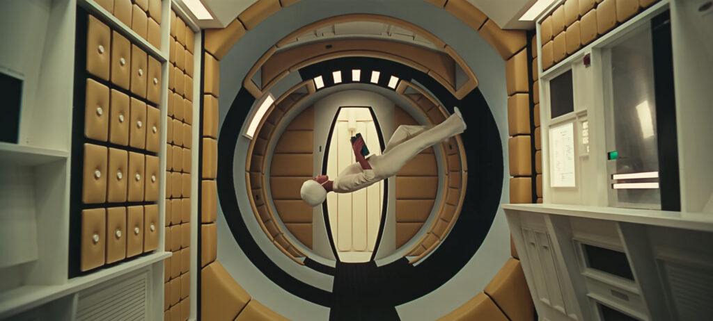 Short of dialogue, the movie focuses on visuals. Kubrick’s trademark symmetric one-point perspective in combination with the carefully designed sets, bold colors and music effectively draws the viewer’s attention. The research and level of detail for the space locations is remarkable. An entire rotating movie set was built in order to simulate gravity force and rotating parts of the space station.
