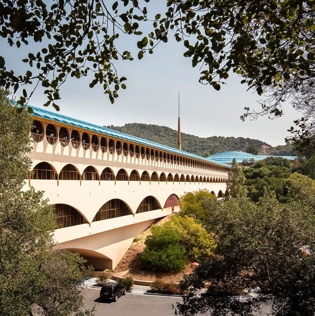 The real-life building used for the space program headquarters is the Marin County Civic Centre. designed by the late Frank Lloyd Wright and completed after his death in 1962. The arch openings along the impossibly long facade, the dome, the skylights, and the spire tower all fit the mood of the story perfectly. A design ahead of its time. Perhaps you recognize the building in question as photographed by Ezra Stoller.