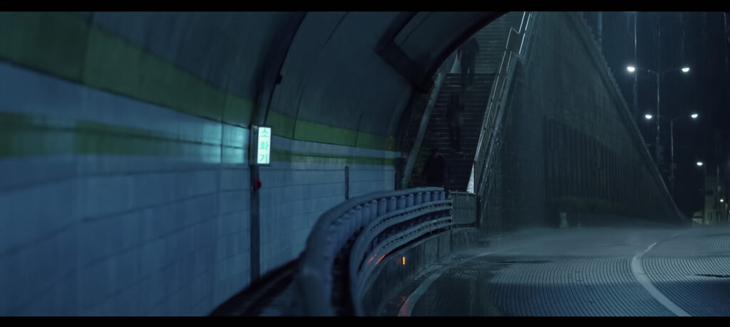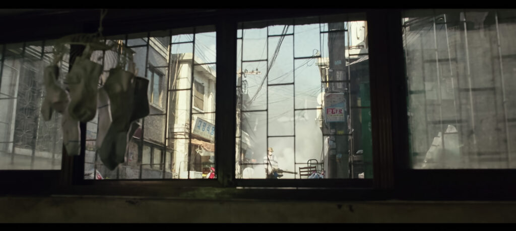 In the same fashion direct sunlight only touches the Park’s family house while dirt and flooding are a constant at the Kim’s family place. Another interesting aspect is that both houses feature elongated windows that match the screen’s aspect ratio; as if they were in some sort of dialog. However, one overlooks a beautiful private garden while the other only sees a part of the lower-class neighborhood.