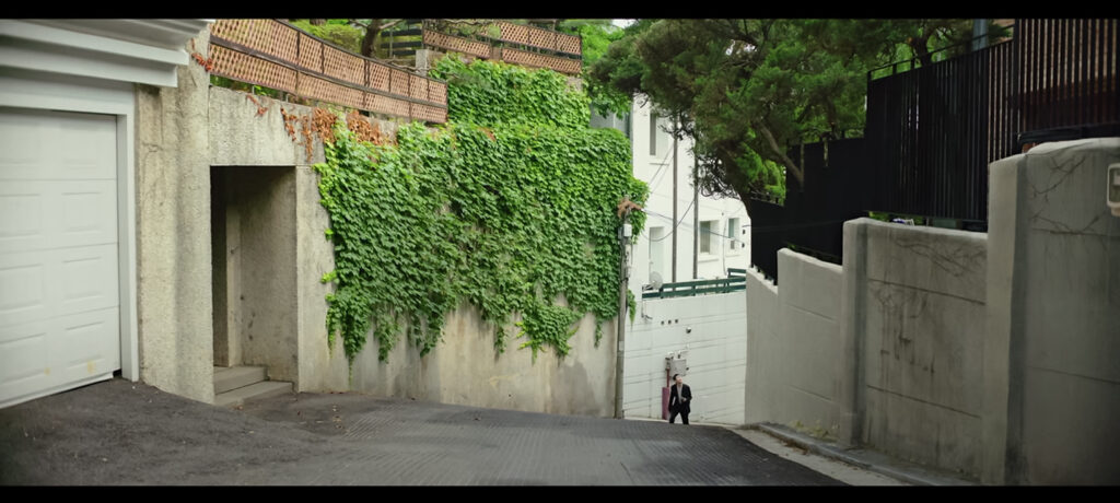 Bong Joon-ho uses architecture as the media to illustrate the difference in social status between the two families. The rich family house is located on a hill, one must go up the stairs to enter and the camera is consciously tilted upwards. In contrast, in order to reach their house, the Kim family must descend several staircases through the city until reaching the semi-basement.