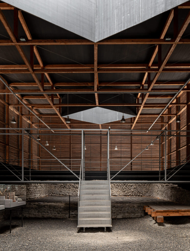 The slats in the facade are placed at an angle so that the excavations are protected from sun and rain without isolating them from their context: you can hear and feel wind breezes that might carry a few snowflakes with them during wintertime. The wooden roof structure forms a tridimensional grid that holds rhomboid-shaped skylights in place that brings in extra light over each one of the three excavations. The construction solution optimizes material and function so that it feels as light as possible.