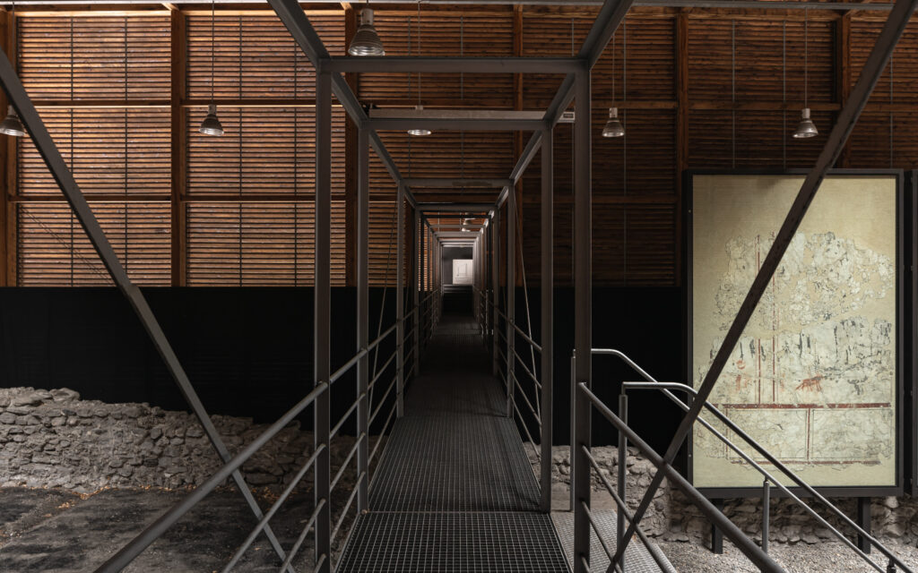 Once you cross the threshold you find yourself submerged in an intimate and protected atmosphere, dimmed lights and dark colors. The tunnel continues on to a suspended light bridge overlooking and connecting the archeological excavations. From there you can notice how respectful the intervention is: the structure has an offset so it never touches the ruins directly, it acknowledges and follows the non-symmetrical footprint of the ancient stone walls and the windows are placed where the original entrance might have been.