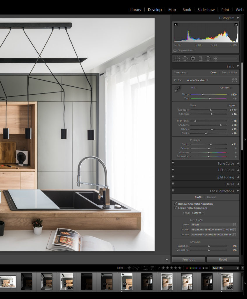 After I applied the preset, I adjusted white balance, exposure, and whites & blacks. It depends on the image, but all the other sliders I touch only if I feel I need to. This happens mostly with exterior shots, where I tend to lift up the shadows less and less.