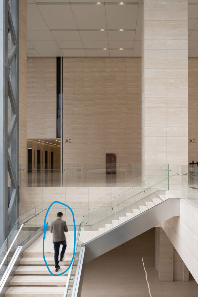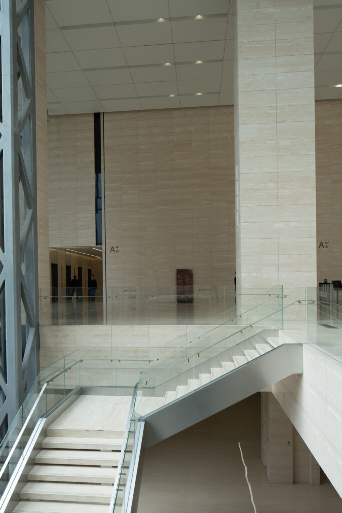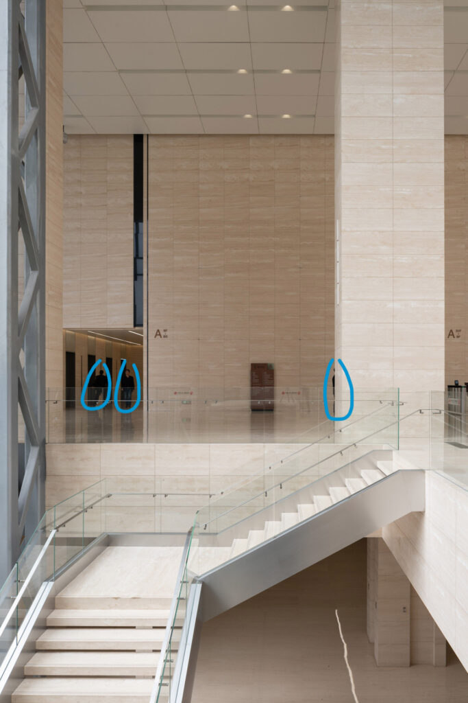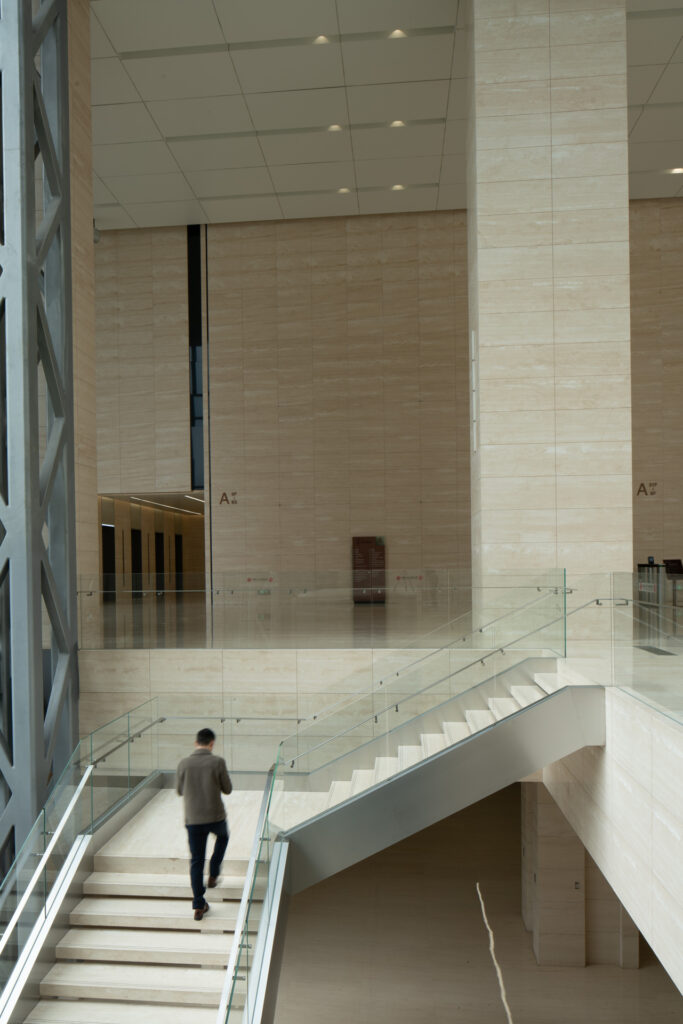 Aesthetically, the shared lobby’s interior design is the exact opposite of the city’s urban madness. It is a calm, minimally designed respite clad almost entirely in warm stone — a peaceful transitional space for workers to pass through on their way to work and back home again.