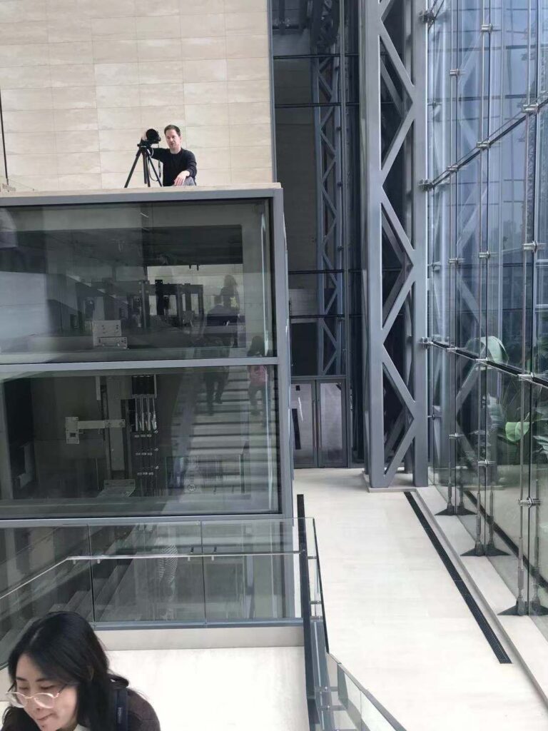As the day was drawing to a close, I realized there was one shot we still needed in order to more fully explain the building’s section and vertical connectivity. Unfortunately, it required getting the camera to a position directly above the trio of glass lifts that connect users between the lower level 01 lobby, and the upper level 08 transfer space.