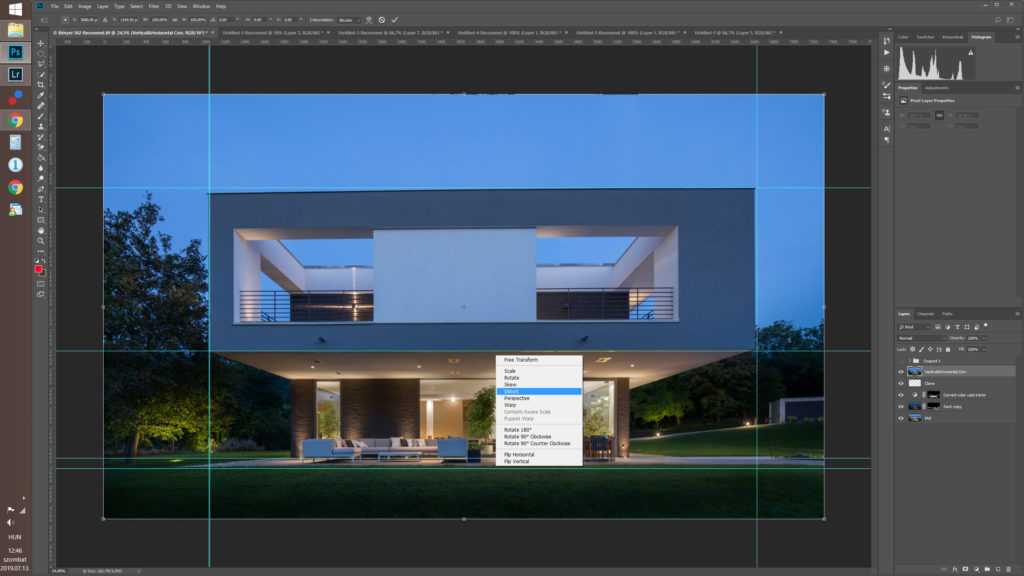 Correcting verticals and horizontals is simple: Select all layers using Shift+Ctrl+Alt+E which will merge everything onto a new layer. Drag out guidelines from the rulers on the edge of the application window to see how much you need to adjust – I usually drag them over the vertical edges of the building. Press Ctrl+T for free transform, right-click and select ‘Distort’ and adjust to taste.