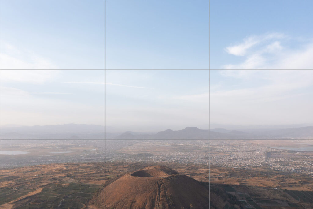 The success of a panorama resides in the amount of overlapping information within the photographs. By using a 3×3 grid I can easily determine (and remember) the horizon and limits within the shots composing a panorama.