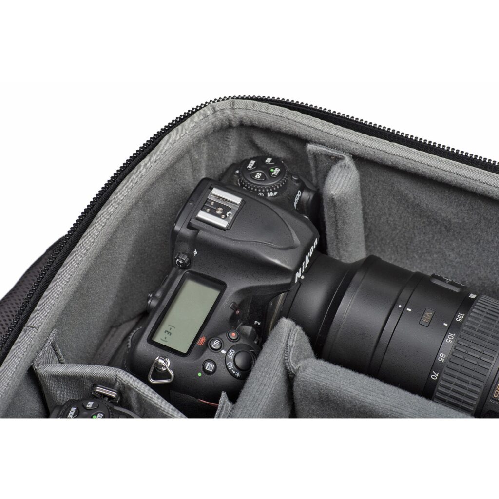 The interior of this backpack can accommodate a lot of gear. In terms of capacity, this model falls between the Essentials Convertible Rolling Backpack and the Airport TakeOff. The biggest difference can be noticed in the width, as the Streetwalker is narrow, and we won’t be able to fit two cameras with attached lenses side by side. The shape is less rectangular, so we also lose some space at the corners of the backpack. On the inside of the flap, there is a special compartment for a laptop, which guarantees its safety during transport. However, this arrangement can make packing and arranging the gear in the backpack more difficult and time-consuming. There have been instances where I packed and closed the backpack without the laptop. The contents filled the interior tightly, so when I wanted to add the computer, I found that the flap wouldn’t close anymore. In the case of suitcases with a laptop pocket located on the outside of the flap, the computer fits regardless of how much stuff we cram inside the backpack.