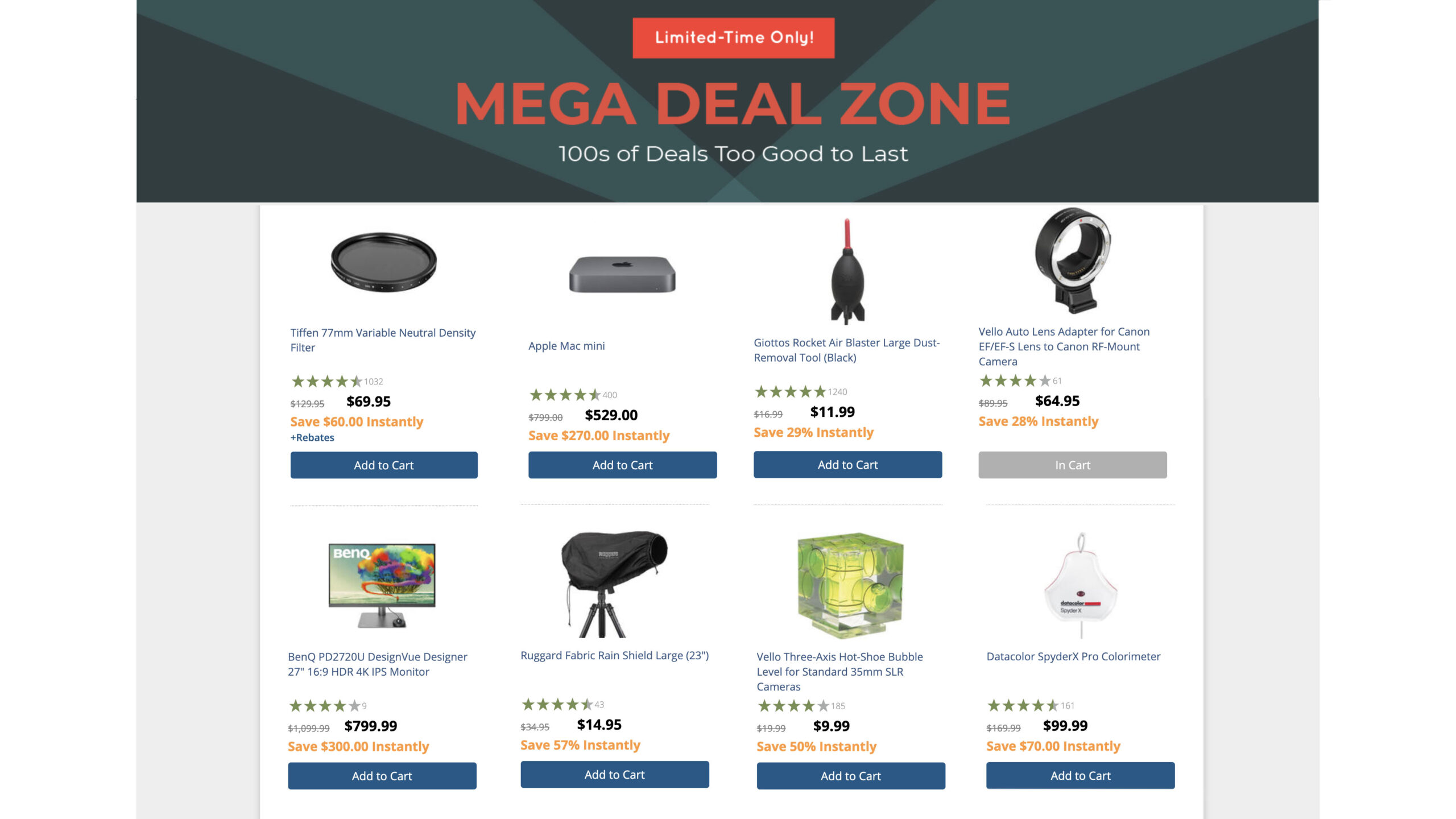 B&H just announced a three day sale with huge price cuts on hundreds and hundreds of items. I popped over to their site to scope out the deals, and while there aren’t really any big-ticket items like camera bodies or Arca Swiss cubes (we can dream, right?), there are a lot of practical items — from rechargeable batteries, rocket dusters, and CPL’s to sliders, gimbals, and a Canon EF to RF mount adapter — that are worth checking out. I even spotted a Mac Mini and BenQ 4k ISP monitor on the list!