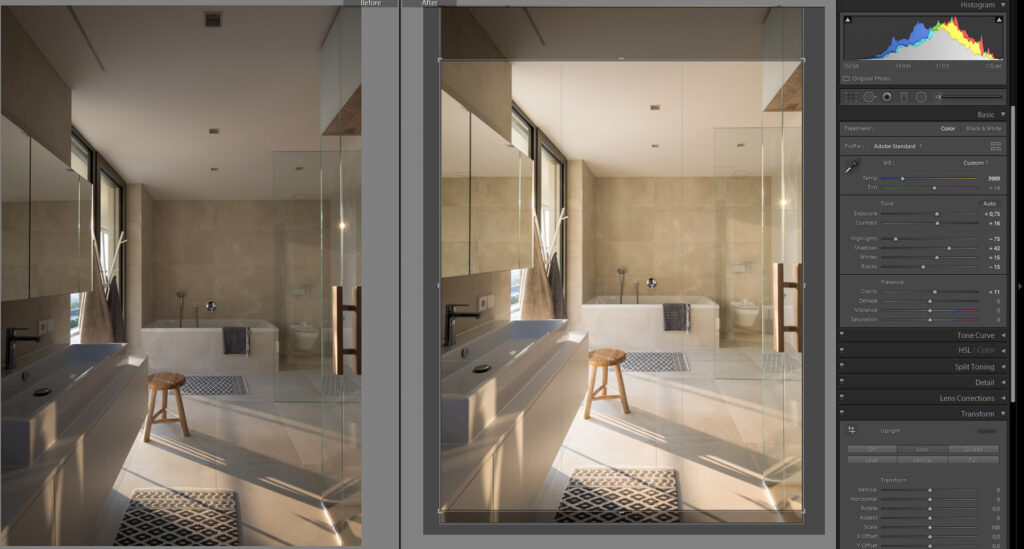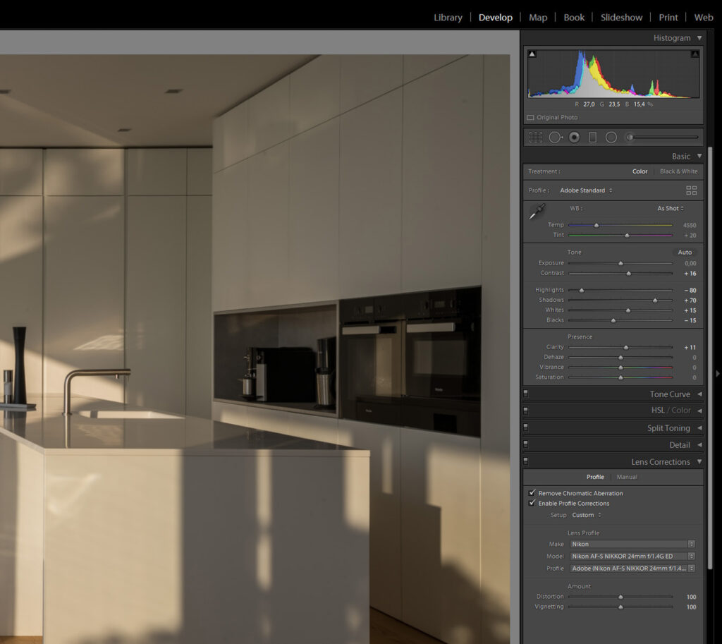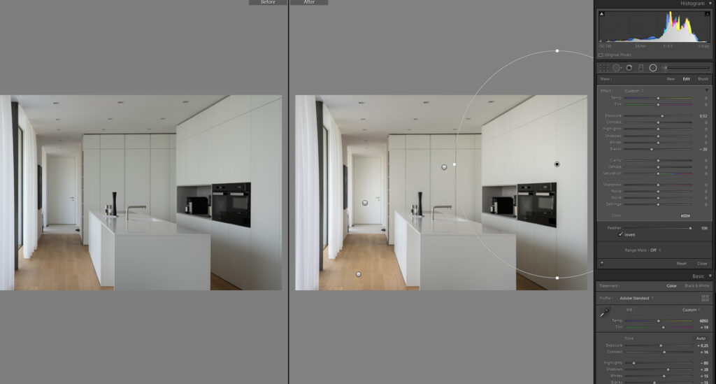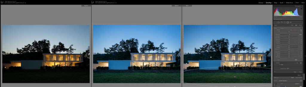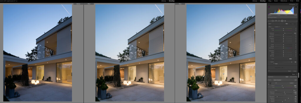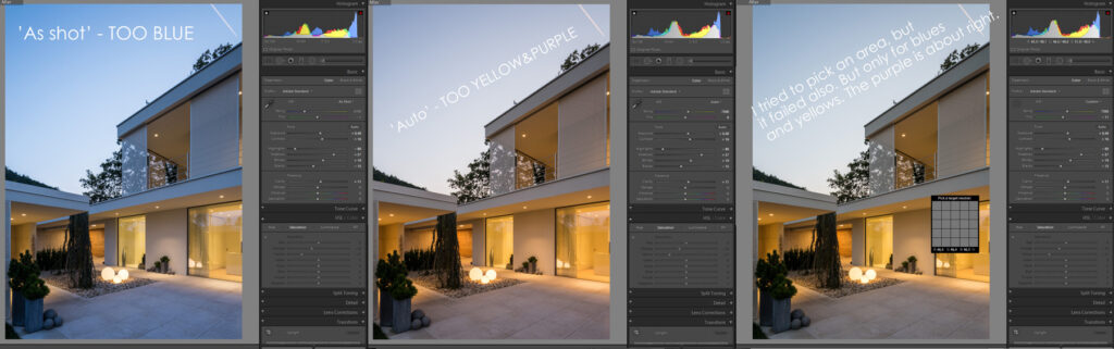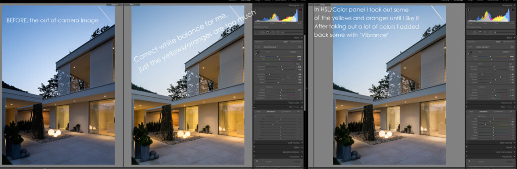 The base settings I added before are obviously not enough for individual images; I tweak them if I don’t like what I see. I adjust the white balance first, which can be tricky for exterior early blue hour images.