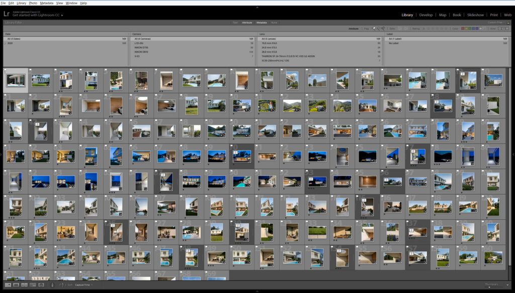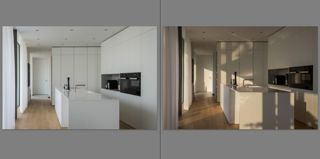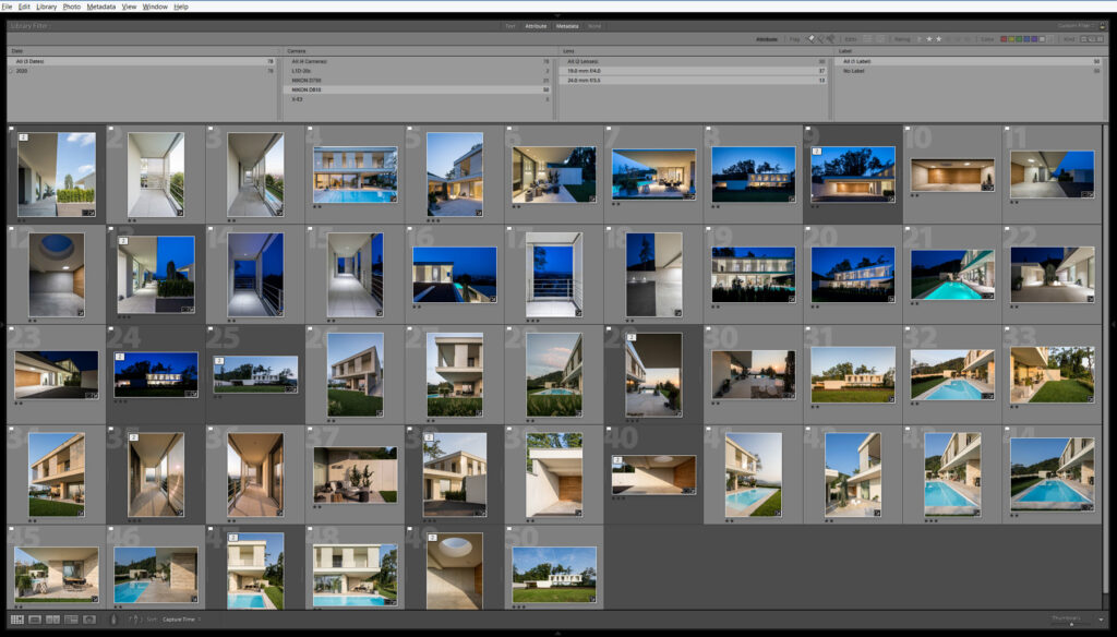 Let’s see how I choose the pictures to be handed over to the architect — which won’t be easy because, as you can see, this plethora of photos was not taken at random. I had a reason to take all of them, and there was a thought process behind each. The truth, however, is that no architect needs hundreds of photos of a project. At least not for a single-family home. So although my job on the spot was to photograph the house to the best of my ability in the time available, now I must compile a gallery from the available footage that shows the house, the design, the unique solutions, and how the house plays with light during the day with due care. How do I do all this? I usually end up giving close to 80-100 images for a project of this length, supplemented by making a 35-50 image selection of my favorites. Are you ready? Let’s jump to it.