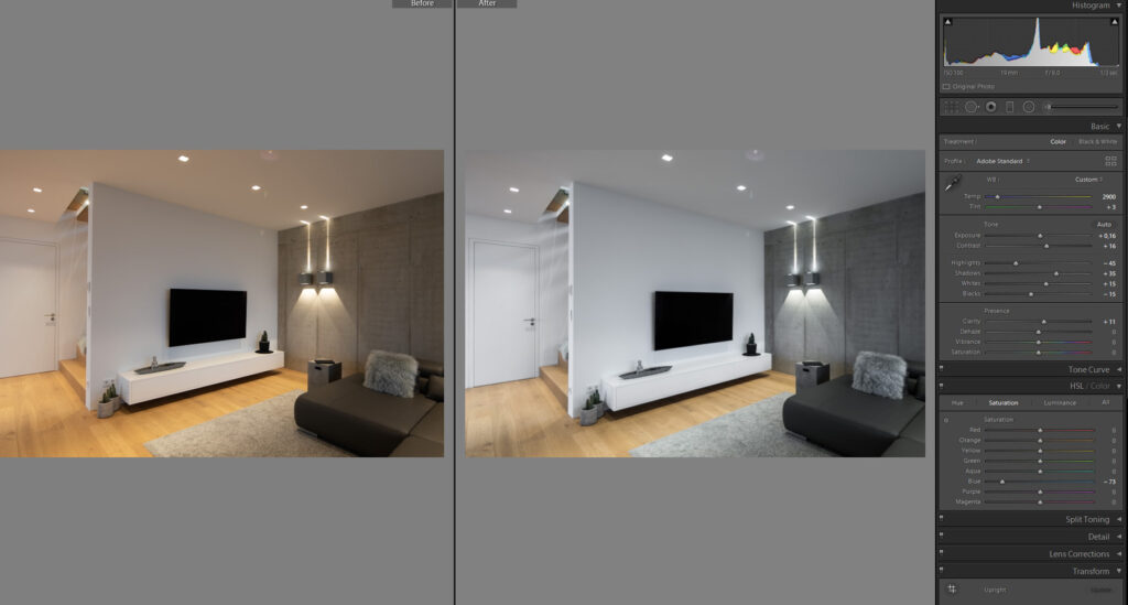 Early blue hour colors with the lights on are somewhat harder to get right, and it is again about personal preference. My goal is to get accurate colors when the lights are on, so I use the color picker on the white wall to set it right, and after that, I remove the blues that come from the window behind me.