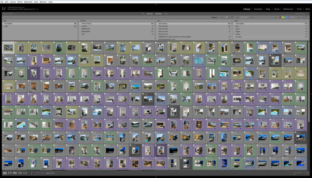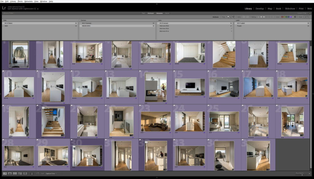 First, I categorize the images I mark with colors. (The default LR settings for the hotkeys are 6-red, 7-yellow, 8-green, 9-Blue, etc) In this case, the images of the pool are shown in blue, the images highlighting the windows are green, and the images marked with yellow are about the large displaceable elements. The interior images got purple color, so if I choose the non-color sorted images, I can see the exterior images which are about the architecture.