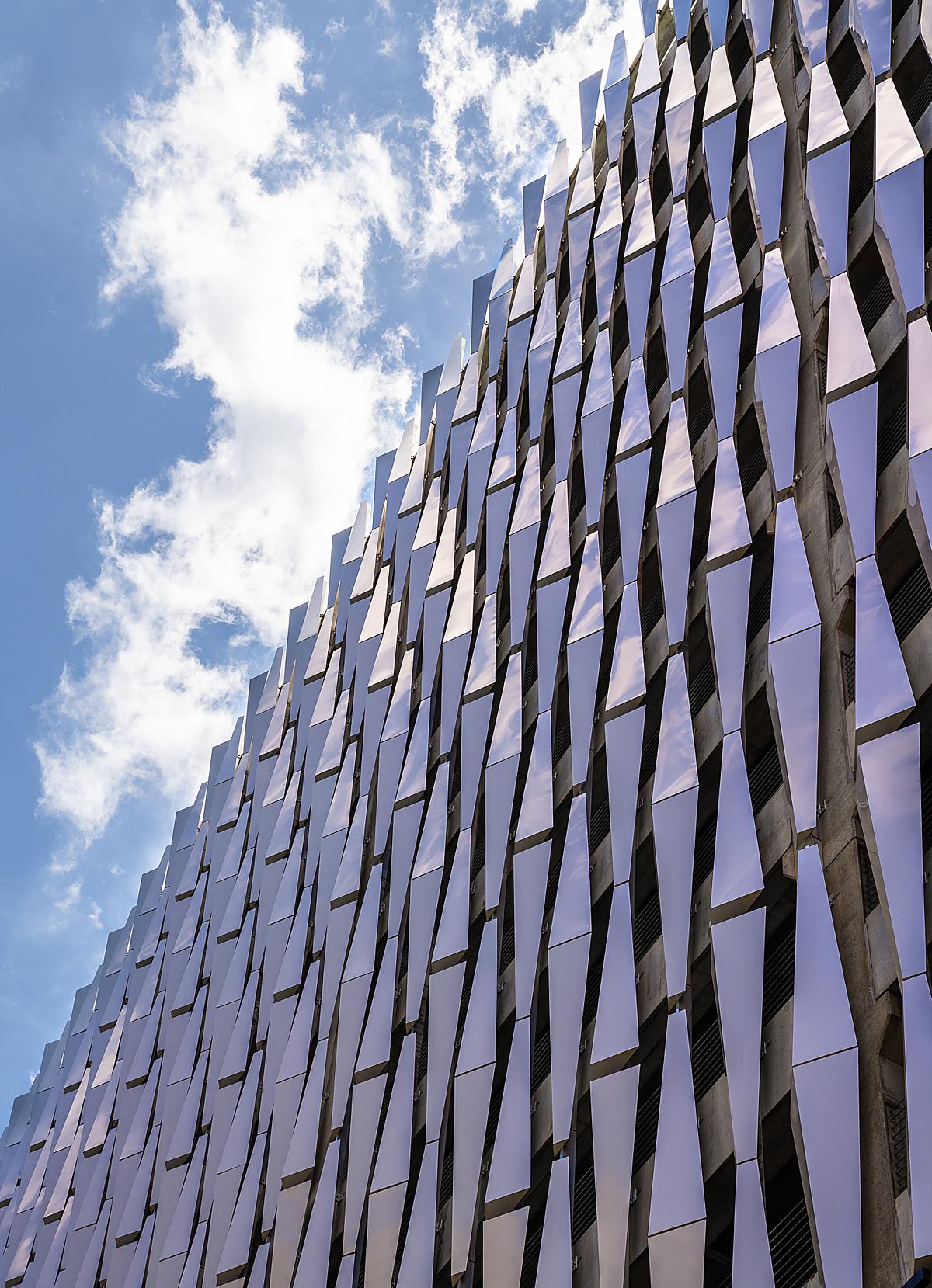 Look at that gorgeous facade. We can see the iridescent gradient of light on the metal panels and the way their complex shape and color are juxtaposed next to the grid of glazing, reflecting the blue sky and clouds.