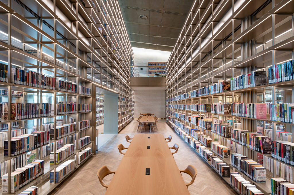 He continues, “During the scouting, I had to choose carefully what I wanted to photograph as the building is fairly large and we only had one day of actual shooting budgeted for this. Although its primary purpose is being a library, the building also houses a restaurant, a coffee shop, meeting spaces, a kids playing area, and even a 3D printing lab and book printing shop. I spent quite a bit of time on the exteriors as I loved the variety of reflections present in the pools around the building. The front of the building is perfectly positioned to be photographed at sunrise, while the side where the main entrance and car access is looks great in the afternoon light.”