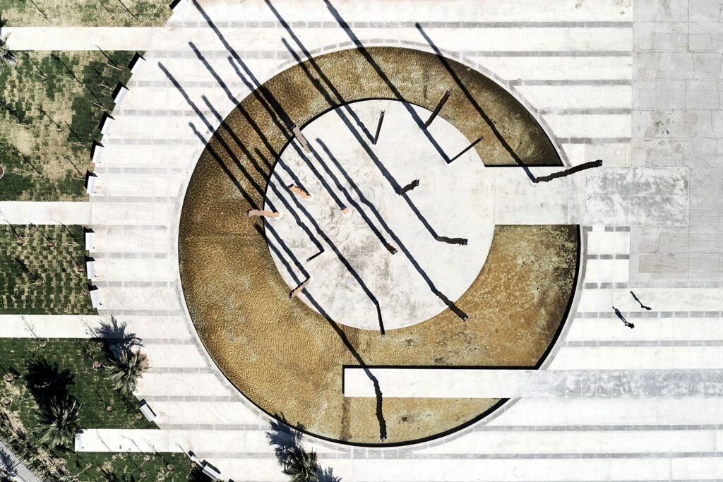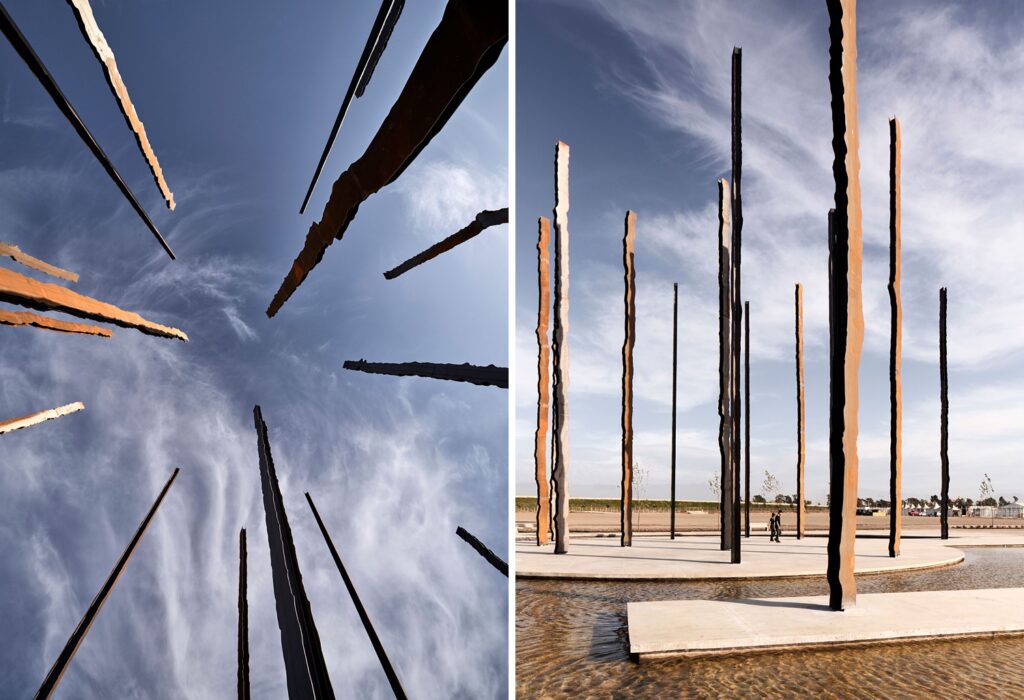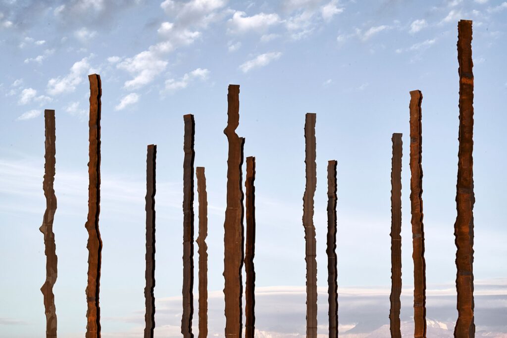 Fernando placed 16 iron columns that mark the outline of the Chilean Andes Mountain on a circular concrete surface, surrounded by a water mirror that establishes a real and symbolic connection between the vertical and the horizontal of the skyline of Andes Mountain.