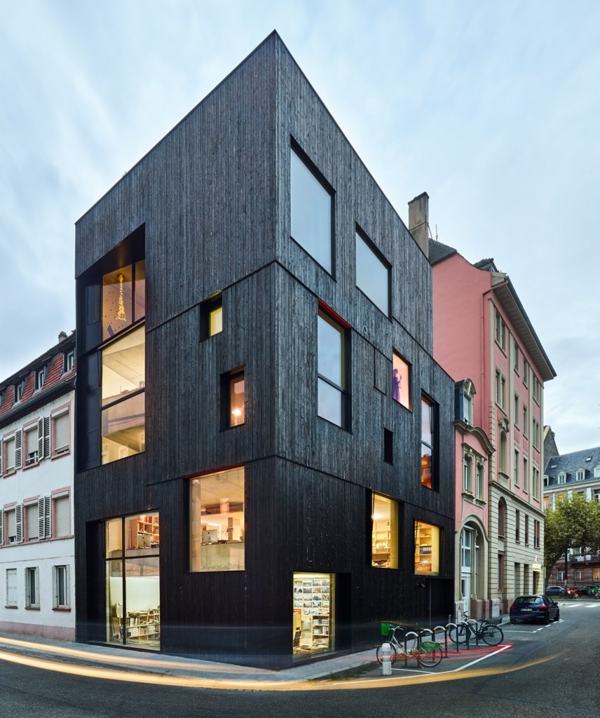 A more intimate view of the exterior highlights the texture in the beautiful charred wood siding. Comparing this photograph to the one above, we are able to note how the awnings extend and retract, adding both functionality and a splash of cheerful color to the space. Eugeni captures the scene with a cyclist pulling up to the bike rack, as well as one passing down the street. I love how they bring life to the image, give scale to the scene, and let us imagine what it would be like to walk (or pedal) up to this gorgeous building each day.