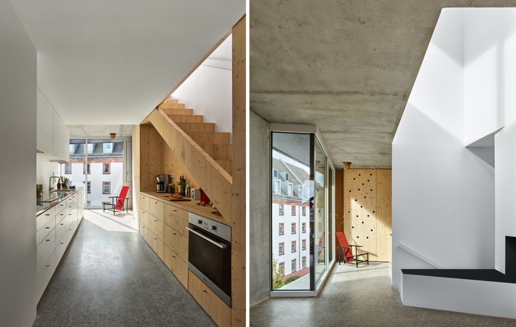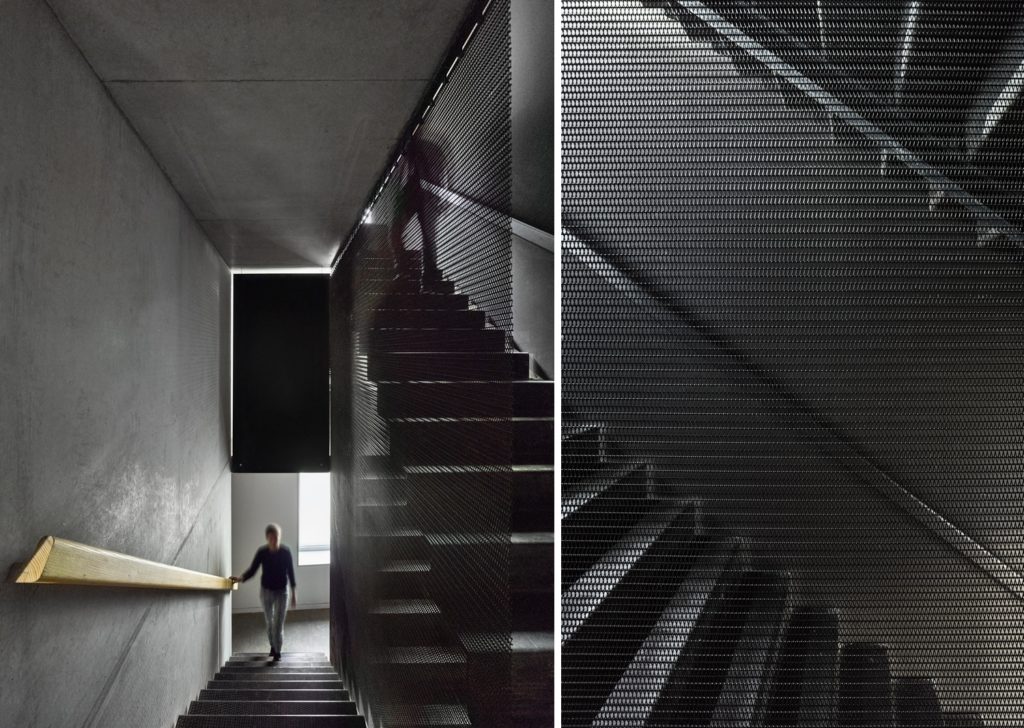What is most noteworthy about DC&A’s office space is that the building was erected on a vacant plot that’s only about 120 square meters. In exchange for a good price on the “hollow teeth” lot, DC&A agreed that their building would be exemplary, run extremely energy efficient, and ultimately be a mixed-use space. Eugeni does an awesome job of capturing this complex project and all of its subtle yet incredible details. On the left, our eyes are pulled through the tidy frame of the kitchen area, noting the stairs that run above the counter and cabinets. We are then able to look beyond, out the massive windows and onto the historic buildings of Strasbourg. On the right, Eugeni’s choice to go vertical cuts off extraneous details of the open-concept space, and allows our eyes to notice what is happening on the ceiling. We are met with a mixture of materials, and able to see the “void” over the fourth floor, that lets the light pour in.