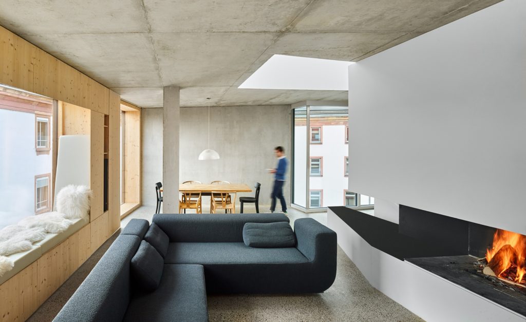 Honing in on the builtin storage and reading nook, we are able to perceive Dominique Coulon & Associates warm feeling design style and their ability to create inviting, functional spaces. Eugeni’s perspective shows how this wall of storage maximizes the functionality of this slightly funky space, while showing us the view of Strasbourg, from four stories up.