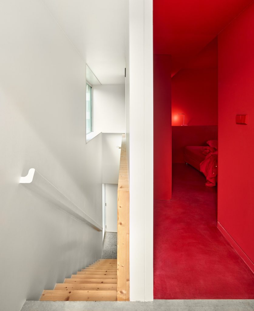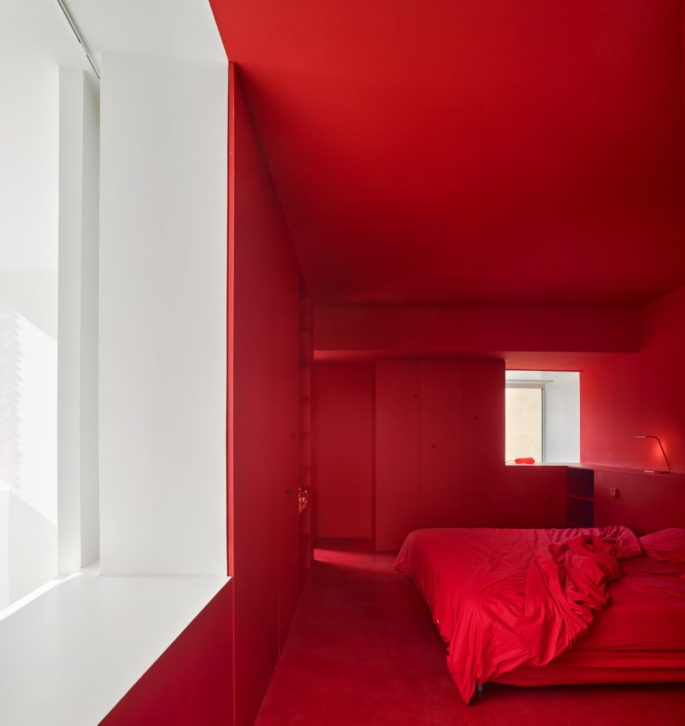 Up the stairs transcending over the kitchen counter, lies what initially caught my attention in this project. Eugeni places himself to show the juxtaposition between the soft light and airy stairwell, and this completely saturated pure red room. What an awesome and rich play on color and mood!