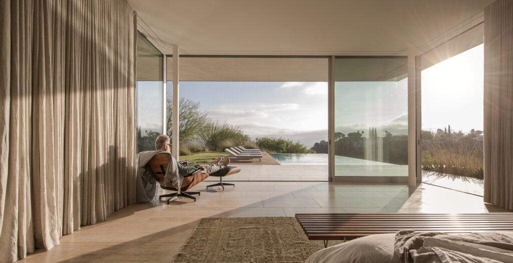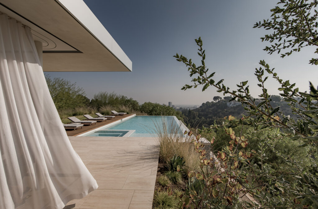 We see those sheers from the last image billowing in the breeze, teleports us right to that space. Not only can I see what it feels like to be there, but the flowing curtain softens the hard edges we find throughout the scene. Francis’ composition is compelling and lovely. The leading line down the center of the frame drives our eyes to the pool. The greenery edging in from the right gives us a sense of place and provides some context as far as the landscape goes while providing balance to the curtain, cantilever, and hardscaping on the left.