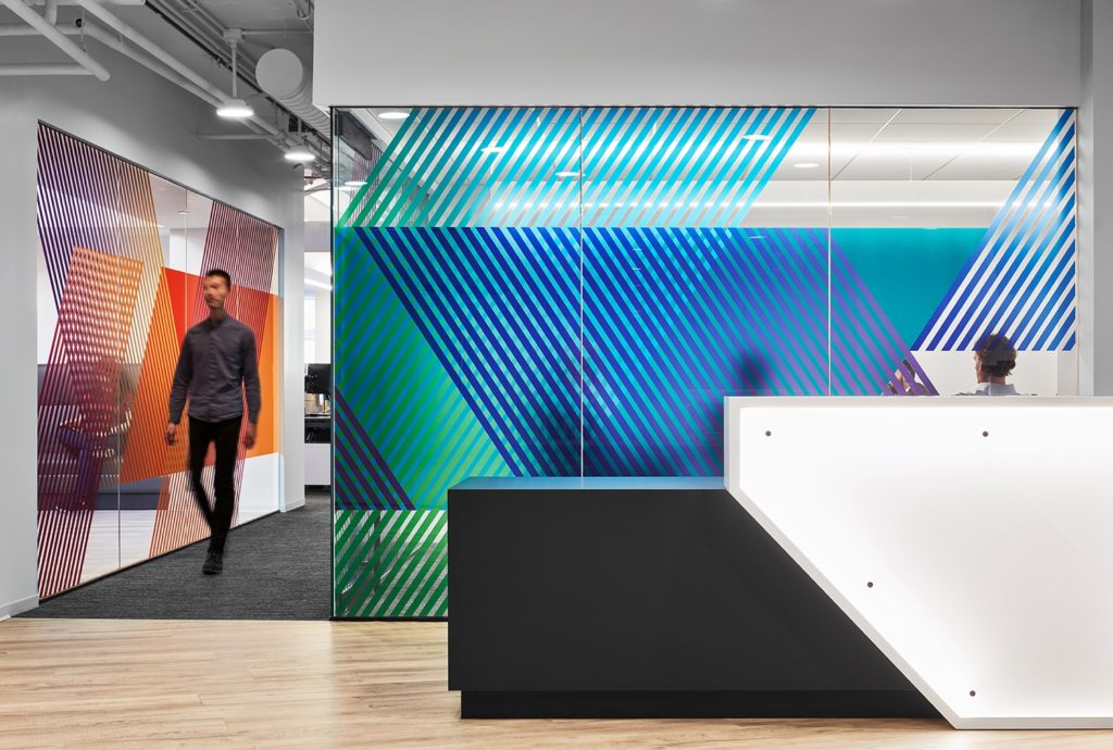 What stood out to me greatly in Kendall’s photos of Euromonitor is how she showcases the space’s unique features in such a tactful and almost understated sort of way, letting the architecture and design speak, while implying the details. Here, I love how Kendall relays the frosted glass of the confrence room by having a figure walk by. This also adds some motion to the bottom of the frame, which plays nicely with the movement created by the zig zagging line in the ceiling.
