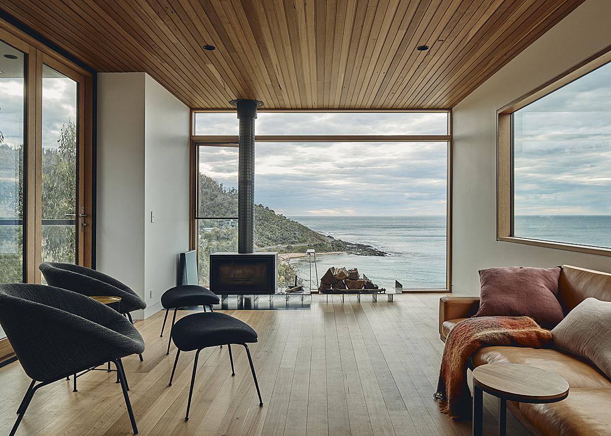 As Peter looks the other direction across the room, we get a good look at the enormous amount of glazing in Y House that gives it such an incredible panoramic view across the Bass Straight — all while meeting the strict codes for the Flame Zone.