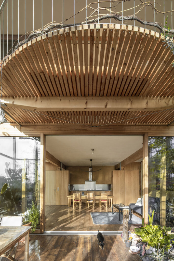 Talking to the owner and architect, he explained to me that the principle of the house is based on the fact that it is a greenhouse because of the weather in the region. During the winter, the house can catch all the light and the sun, which is possible thanks to the huge glass windows that enclose mainly the social area of the kitchen/living room and the dining room. During the summer, when the temperature gets really high, they can open part of these glass windows to create cross ventilation. Besides, the leaves of the trees in the garden help to hold back the sun.”