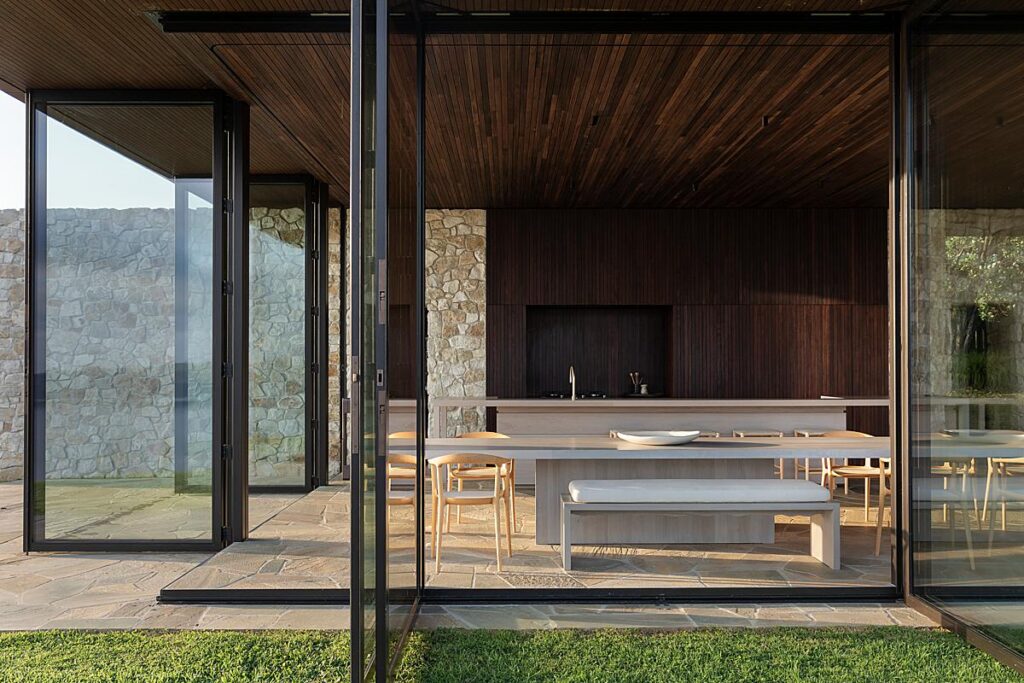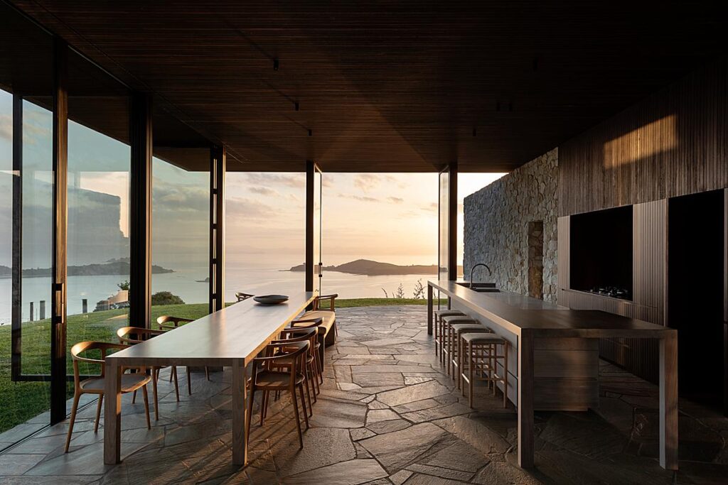 Sam gives us a good look at the rectilinear shape of the Cowes Bay house, and how that same shapeliness echoes through out the various parts of the architecture and the furniture present. There is a nice repetition created by the lines of the articulating doors and their frames. The directional lighting gives a sense of depth and dynamism to the room.