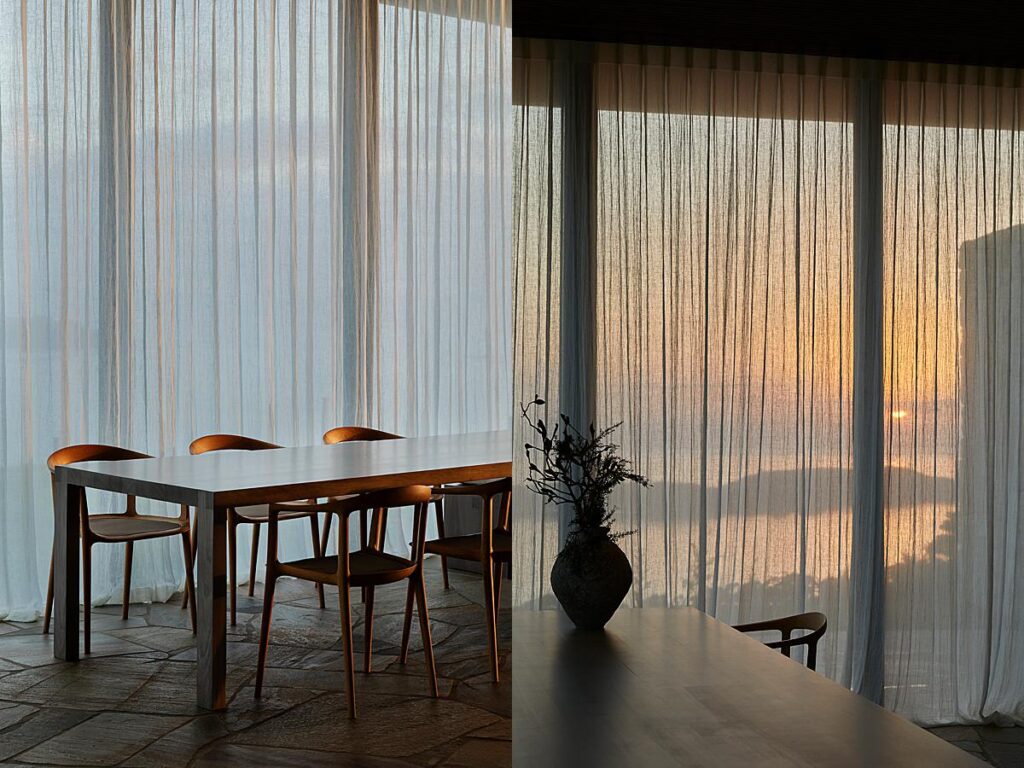 Sam breaks down the scene into a tighter image. Not only does drawing the sheers partially closed create a delicate and soft light, but it creates a striped pattern that echoes the slatted wood wall on the right. It also drives our eyes right through the kitchen and out to the incredible view beyond.