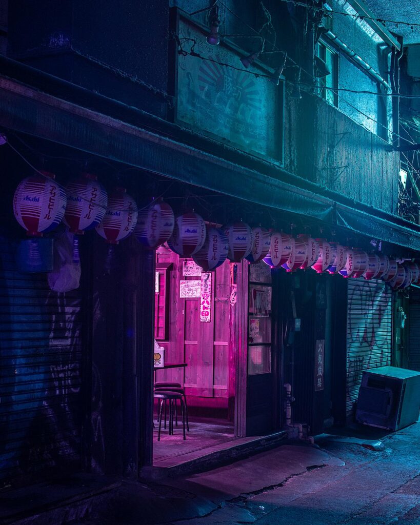 Doesn’t Nihon Noir make you feel as if you were living in Blade Runner? The inky blacks and cool tones of Tom’s images are other-worldly. It’s the cyans, purples, and magentas that pull us in to this dark and futuristic setting.