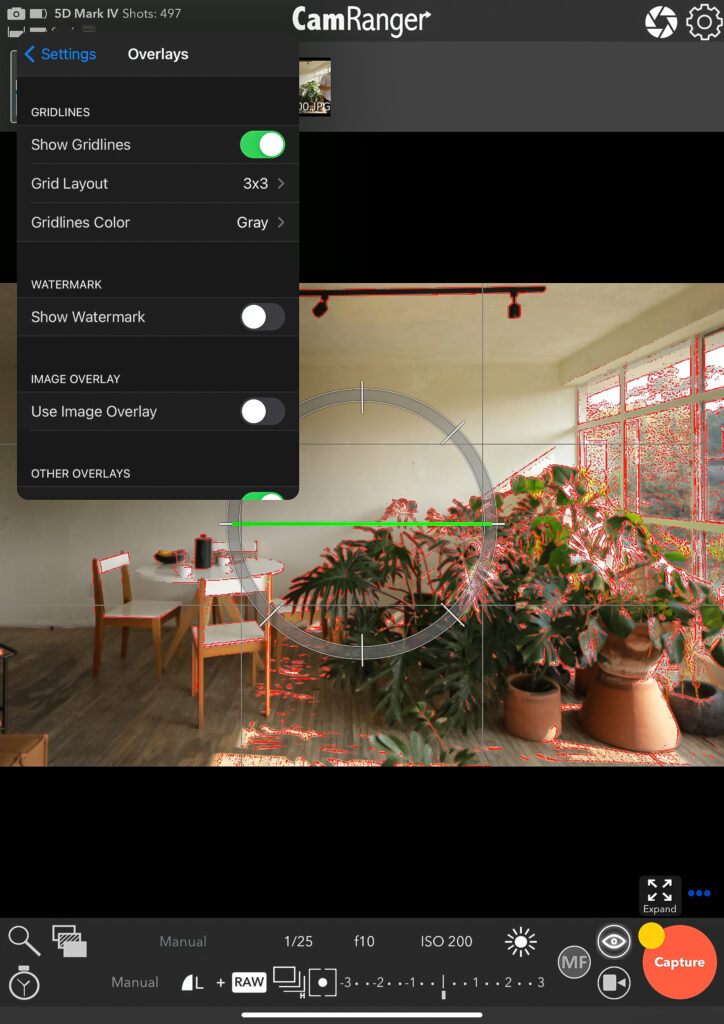 The app is really intuitive and it has extensive features built in. For example I have added an overlay grid, electronic level and focus peaking in the live view screen. Main camera settings are located at the bottom. Clicking one of them will display an array of 12 parameters simultaneously, which in my opinion is infinitely better than tapping or scrolling.
