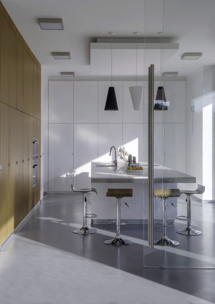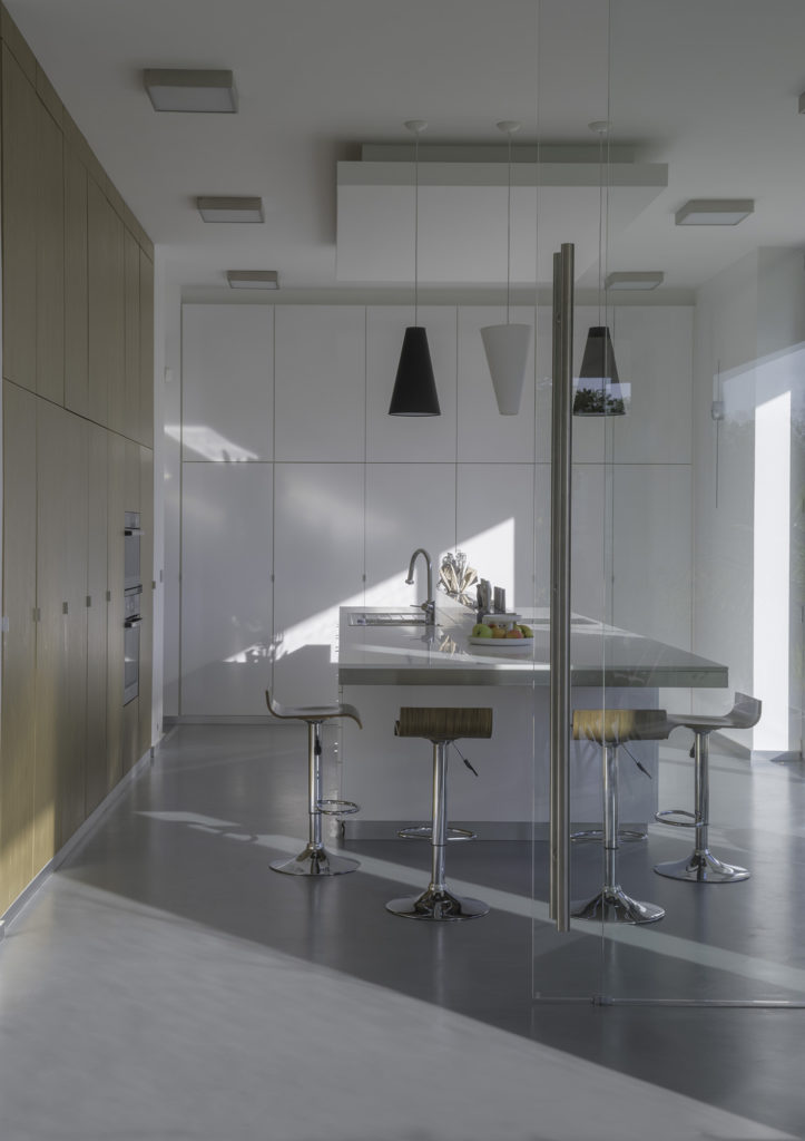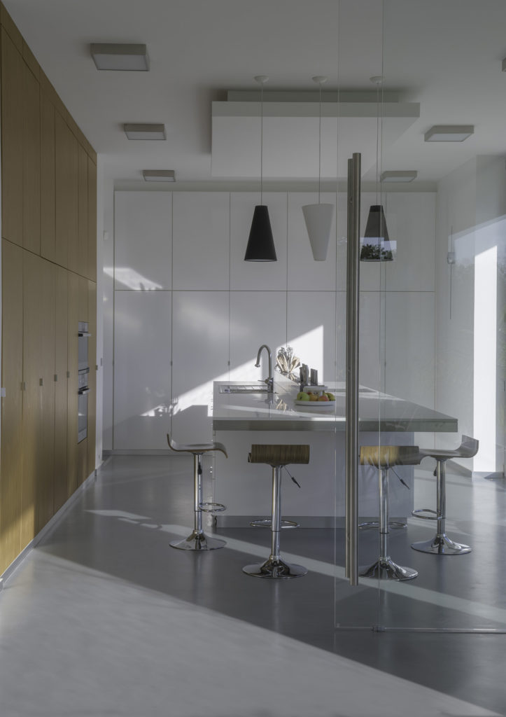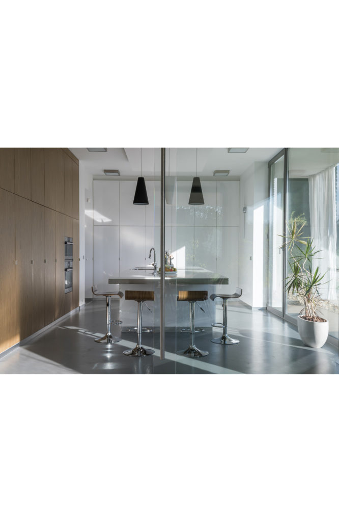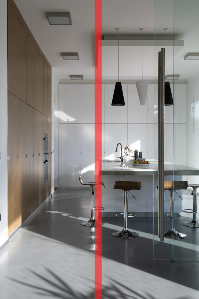 The famous one-point perspective is a strong compositional tool I use on more the 80% of my images. First I tried to shoot with the 24mm TS lens, but there were a few things I didn’t like in that image: it felt a little distorted and not as graphic as I would have liked. I moved back and a bit higher, and put the lamps in a much nicer position. I could also see the corner of the cabinet and the kitchen island, as well as more of the countertop.